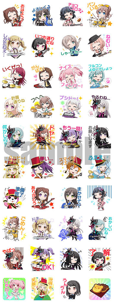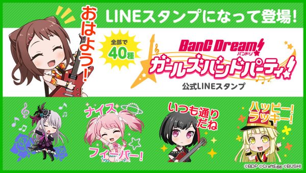 News 2017.07.27グッズ 「バンドリ! ガールズバンドパーティ!」LINEスタンプ配信開始! 「バンドリ! ガールズバンドパーティ!」のLINEスタンプが本日配信開始されました。ゲーム内で登場するスタンプや新たに追加されたスタンプなど、計40種のスタンプが登場です。ぜひ協力ライブ仲間などのお友達と送り合ってご使用ください。また、LINEスタンプの発売を記念して、7月27日(木)より、ゲーム内で使用できるスタンプを2つプレゼントいたしますので、ログインしてお受け取りください。※受取期限はございません。 SHARE