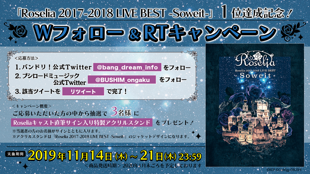 <Roseliaキャスト直筆サイン入り特製アクリルスタンド>が当たるWフォロー&RTキャンペーンを実施いたします!