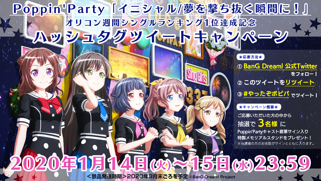 <Poppin’Partyキャスト直筆サイン入り 特製メモリアルスタンド>が当たるハッシュタグツイートキャンペーンを実施いたします。