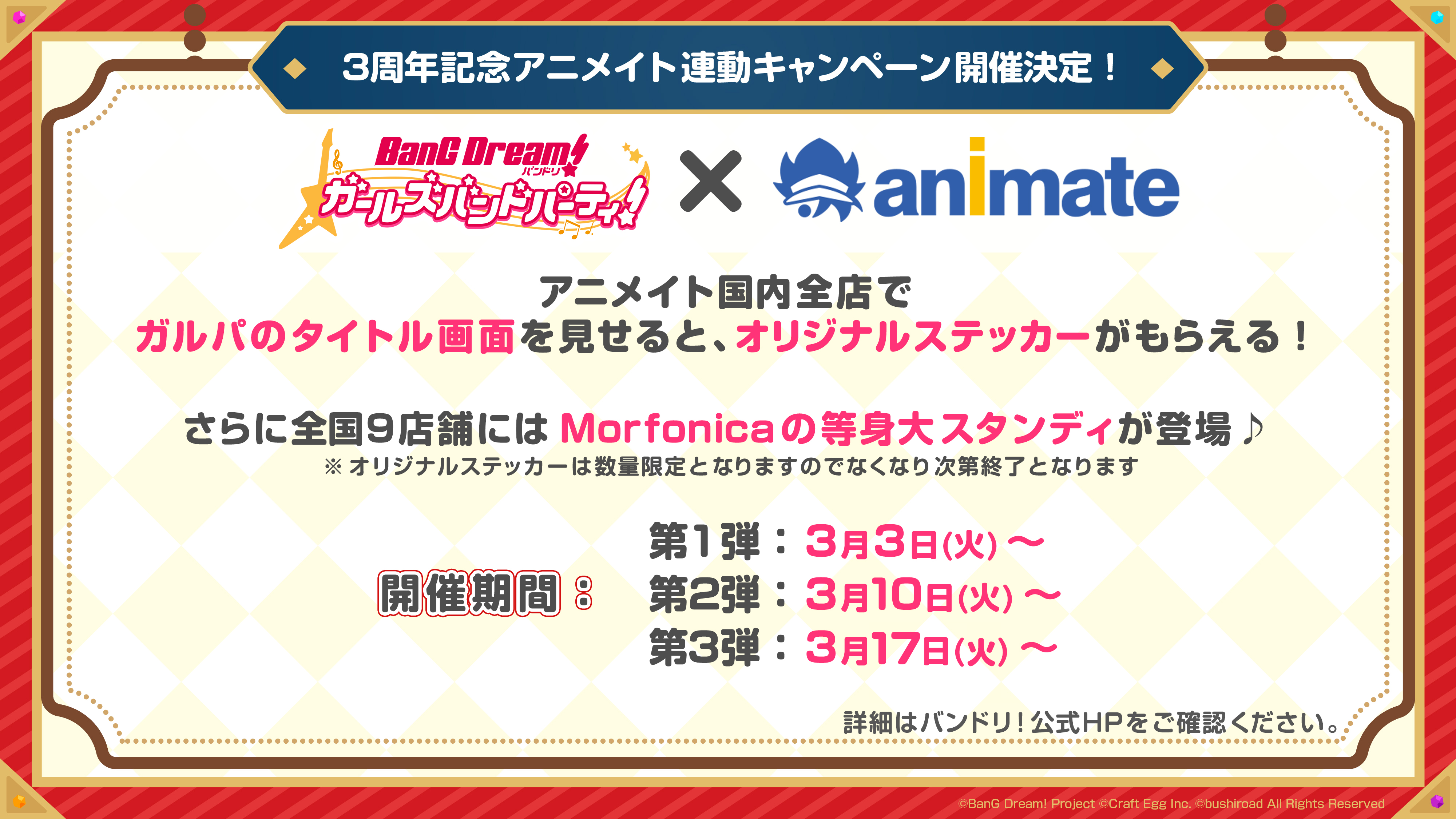 アニメイト国内全店にてガルパのタイトル画面をご提示いただくと、オリジナルステッカーをプレゼント!