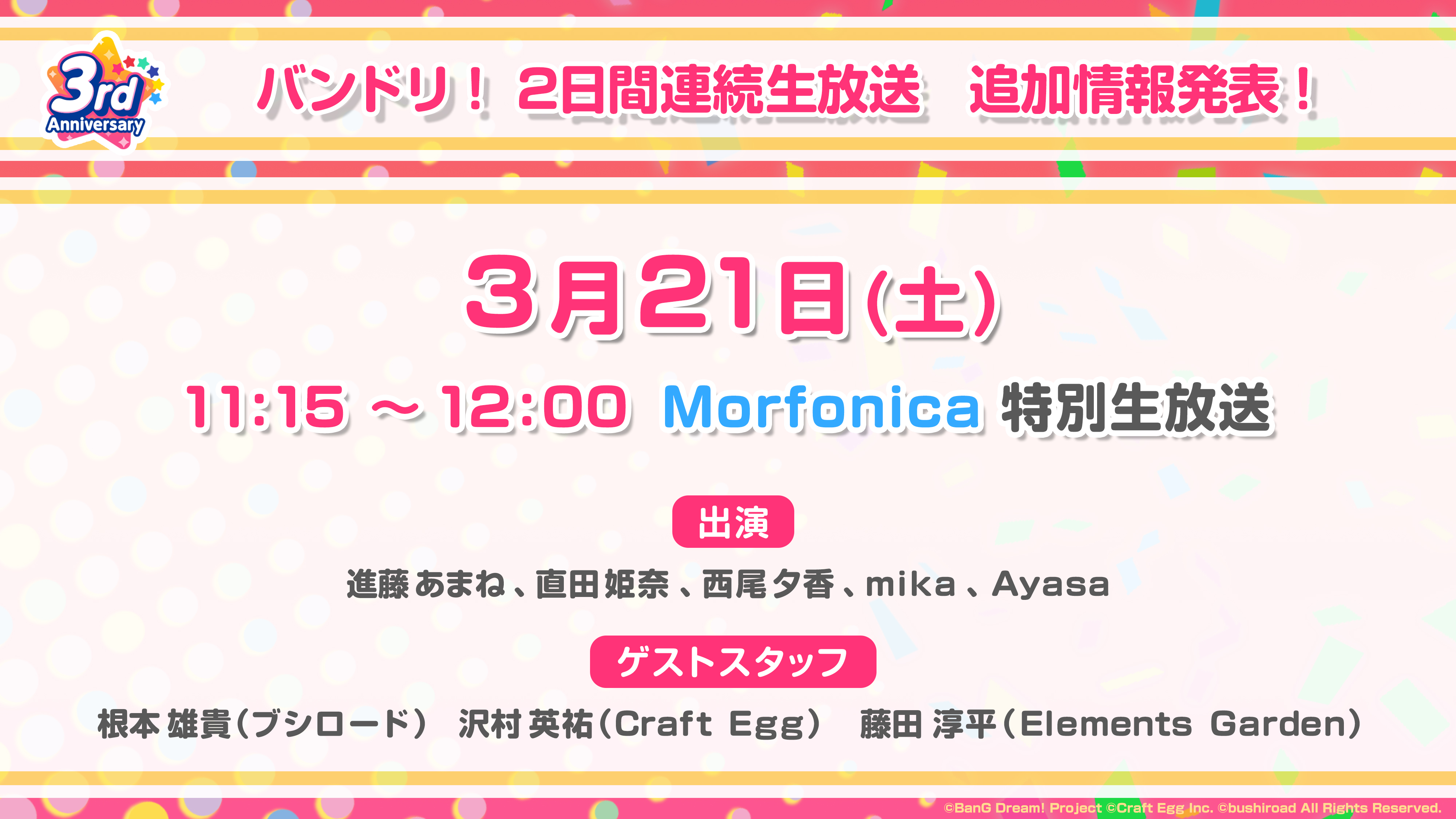 3月21日(土)・22日(日)に放送予定の「バンドリ!2日間連続生放送」にて、「Morfonica 特別生放送」の放送が決定いたしました。