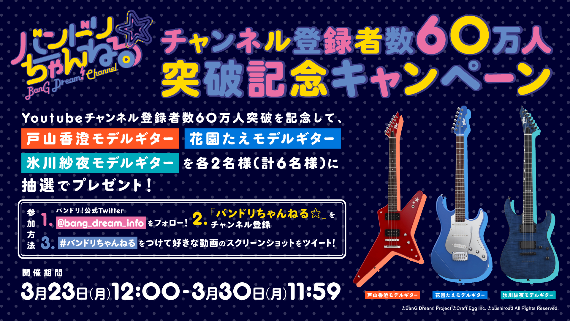 戸山香澄モデルギター・花園たえモデルギター・氷川紗夜モデルギターを抽選で2名様(計6名様)にプレゼント!