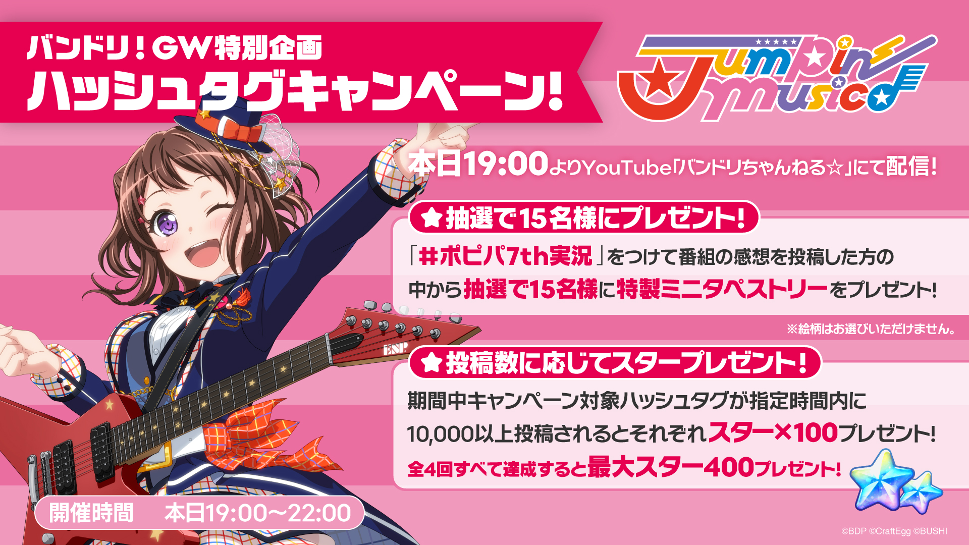 「バンドリ!GW特別企画」の生放送全4回すべて達成すると最大スター400プレゼント!