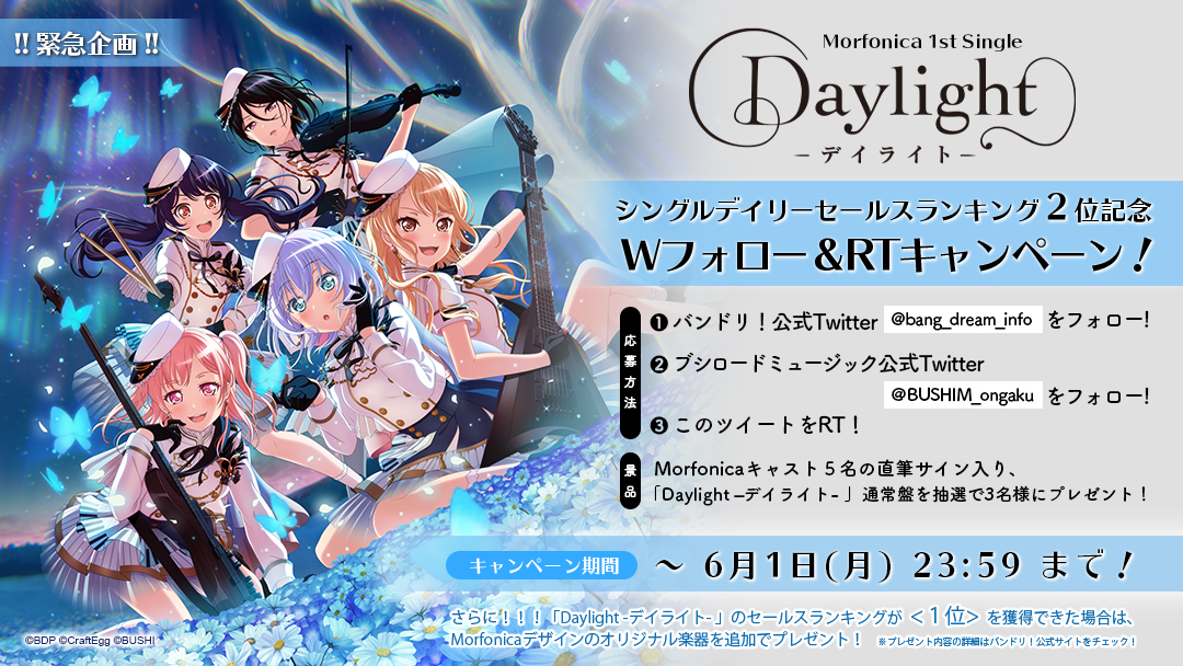 5月27日(水)発売、Morfonica 1st Single 「Daylight -デイライト- 」が、シングルデイリーセールスランキングで2位を獲得することができました!