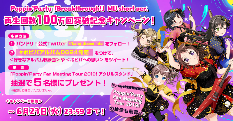 6/24(水)発売のPoppin'Party「#Breakthrough!」MV short Ver.のYouTube再生回数が100万回を突破?