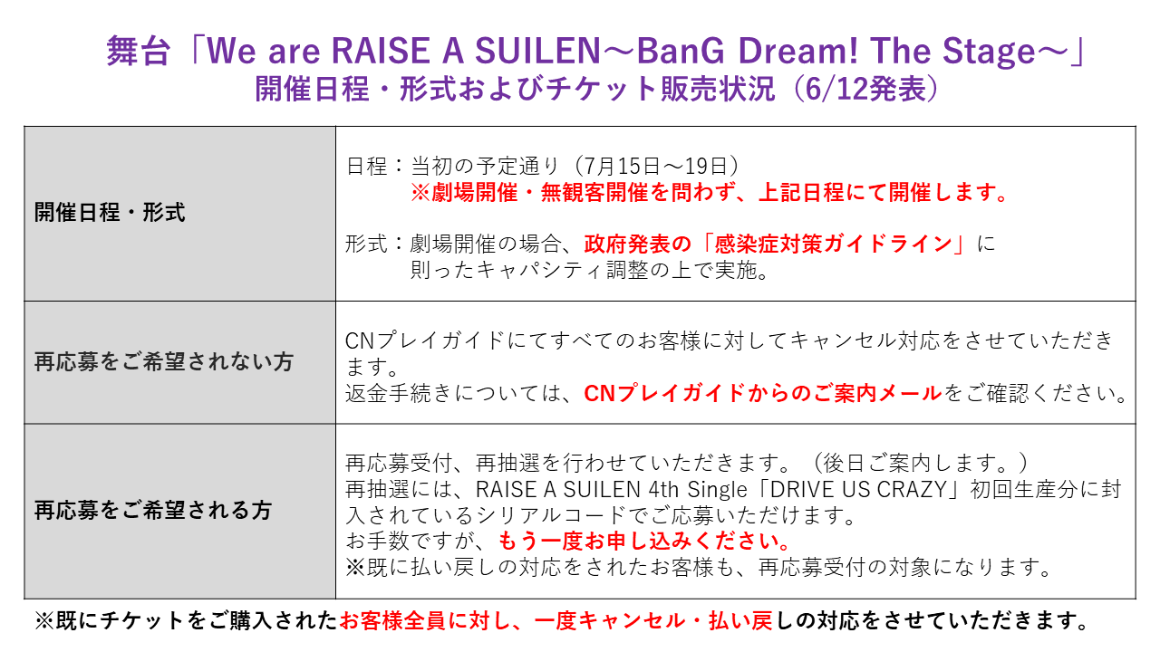 【6月12日 14時更新】舞台「We are RAISE A SUILEN〜BanG Dream! The Stage〜」開催・チケット払い戻しのお知らせ