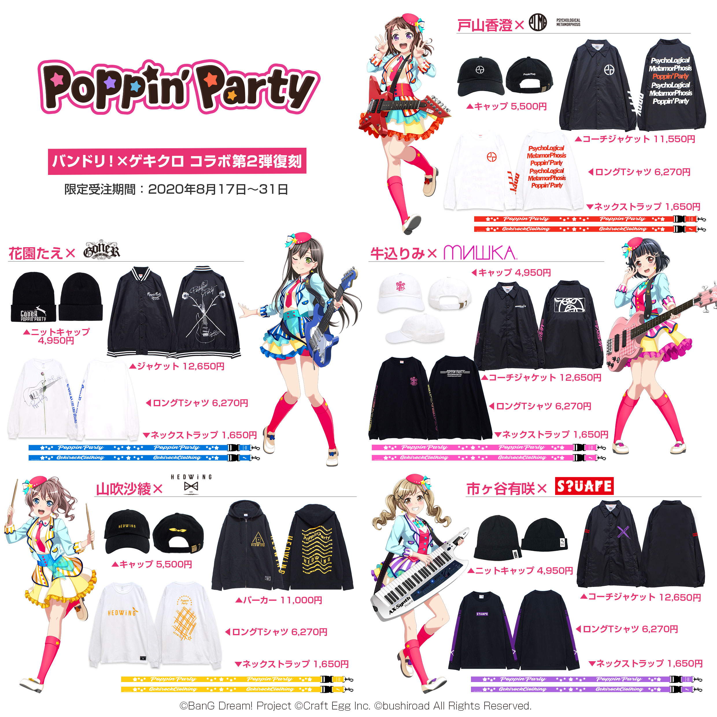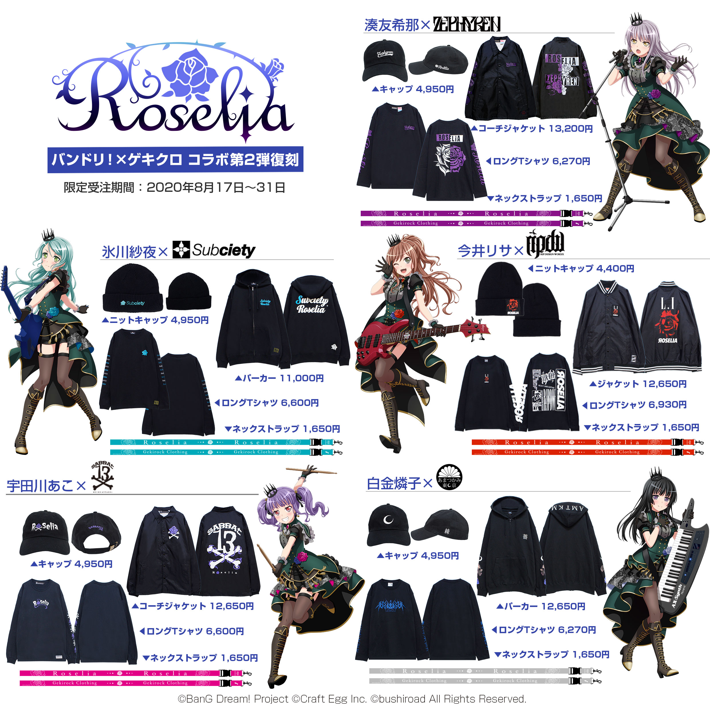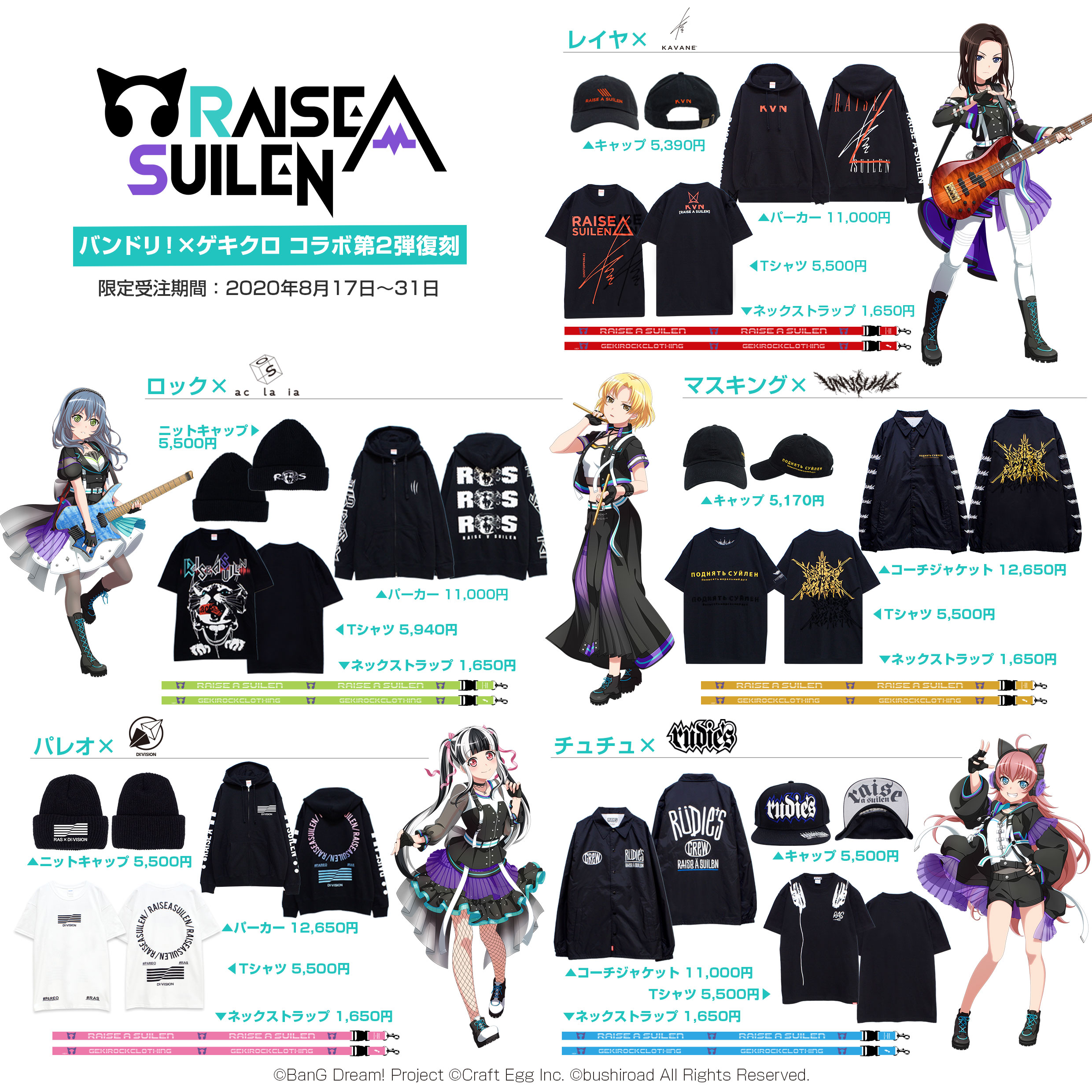 コラボ第2弾のPoppin'Party、Roselia、RAISE A SUILENが8/17(月)~より受注販売開始、第3弾以降も今後販売予定です。