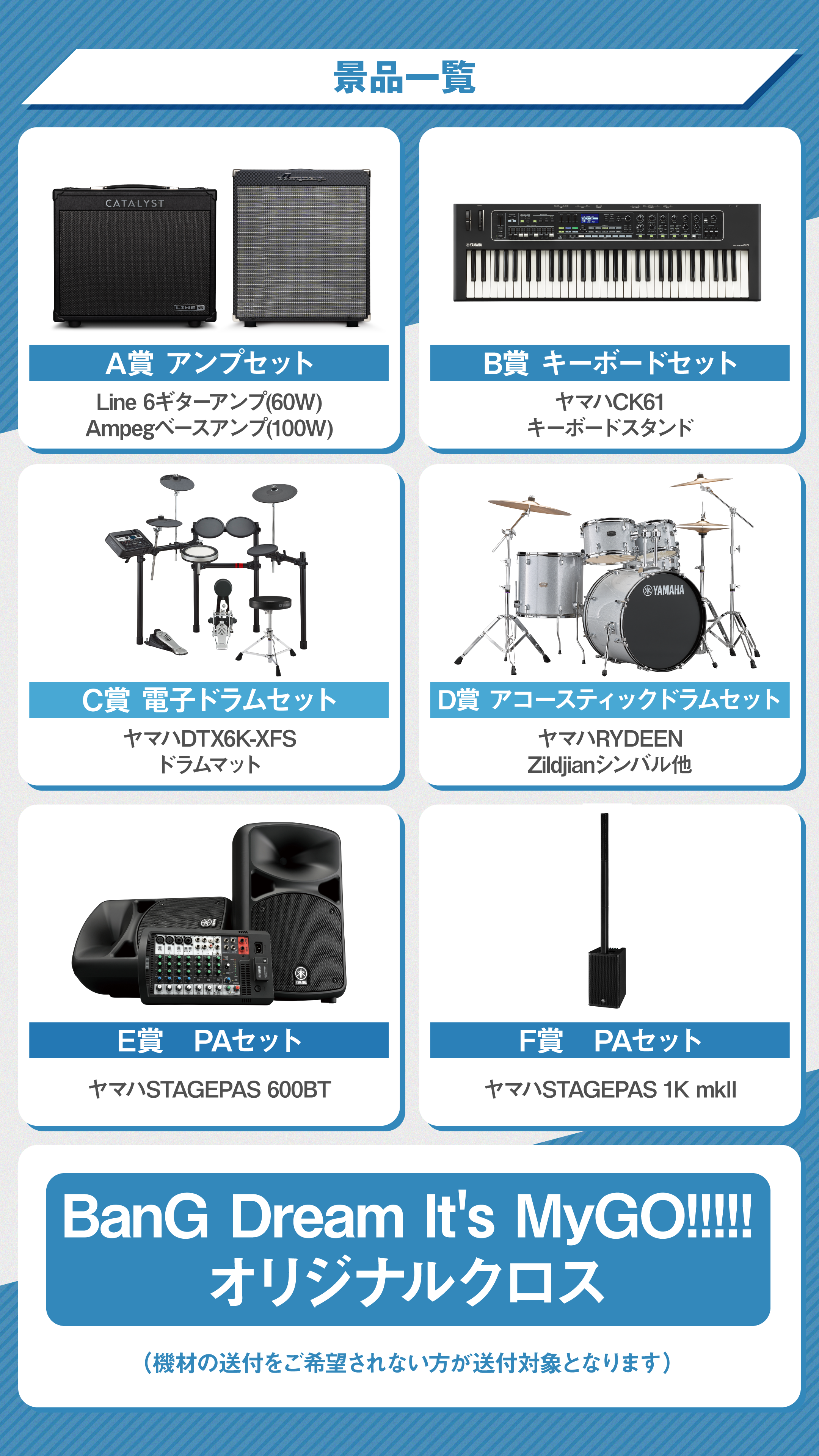 音楽機材・PAもしくはオリジナルグッズを抽選で送付いたします。