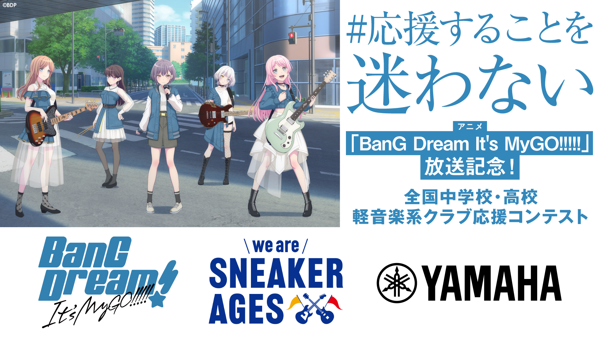 アニメ「BanG Dream! It's MyGO!!!!!」放送記念! 全国中学校・高校軽音楽系クラブ応援コンテストは、アニメ「BanG Dream! It's MyGO!!!!!」とスニーカーエイジ実行委員会と株式会社ヤマハミュージックジャパンが全国の中学校・高校の軽音楽系クラブを応援するキャンペーンです。