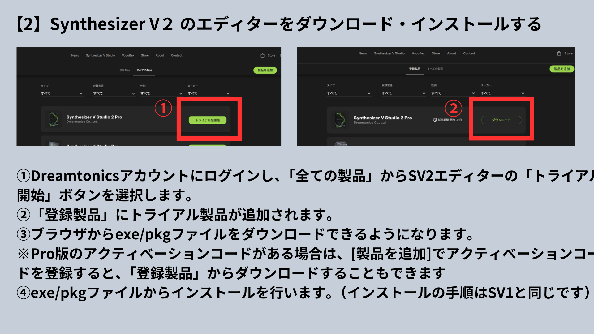 ①Dreamtonicsアカウントにログインし、「全ての製品」からSV2エディターの「トライアル開始」ボタンを選択します。