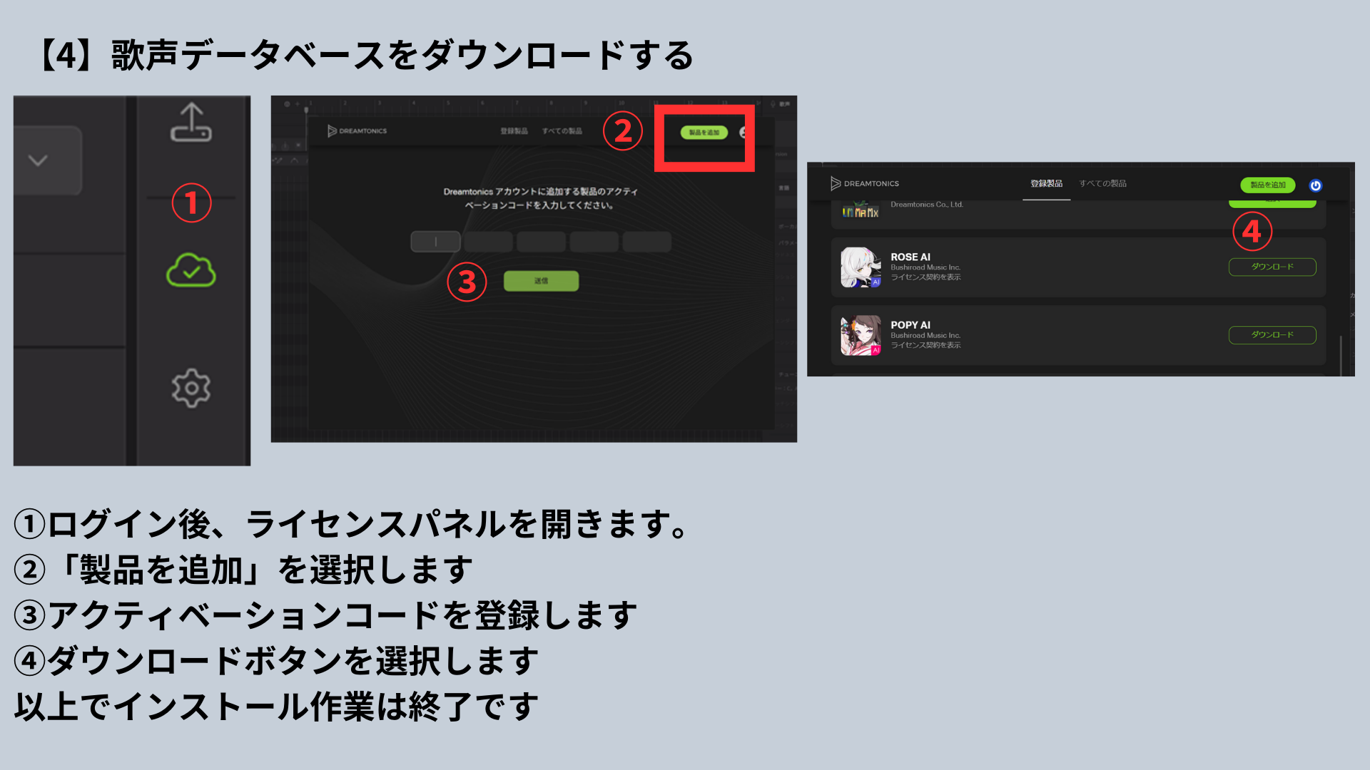 SV2エディターおよび歌声DBは、Dreamtonicsアカウントでダウンロードを行うため、